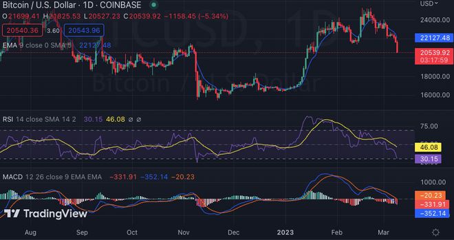 MACD 水平也显示市场看跌势头,橙色线低于蓝色线。MACD 直方图似乎也处于负值区域,表明 BTC 市场看跌。