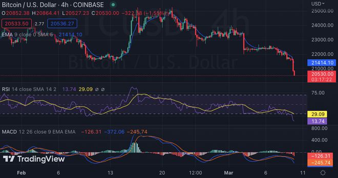 4 小时比特币价格分析表明,只要空头保持主导地位,价格水平就会继续下跌。在最近几个小时经历了一定程度的下跌后,BTC 价值在 20,870 美元左右波动。
