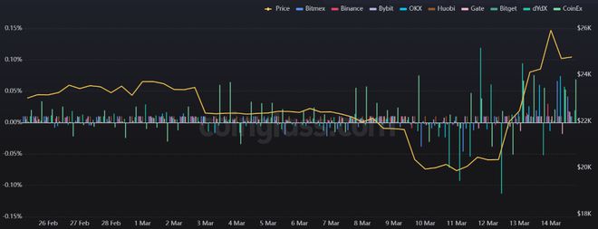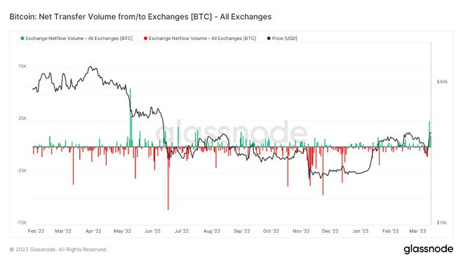 Glassnode 的交易所流量数据在 3 月 13 日录得自 2022 年 5 月以来最大的交易所流入量。这意味着交易所供应量增加,潜在的抛售压力更大。