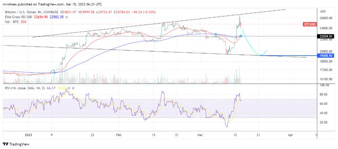 买家未能在 3 月 14 日进行形态突破,现在正面临 26,700 美元上限的阻力。与此同时,未来几天价格有可能回调至 19,500 美元附近的形态底部。