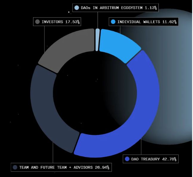 $ARB 的供应上限为 100 亿个代币,分布如下:DAO 财务:42.78%,团队和未来顾问:26.94%,投资者:17.53%,个人钱包(空投):11.62%,Arbitrum 生态系统中的 DAO:1.13 %。
