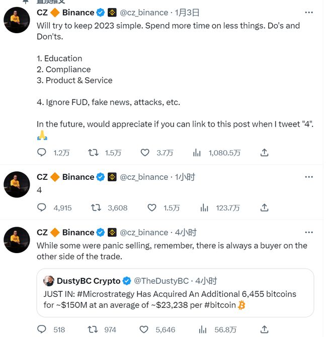 所以虽然这条新闻在市场中引发了新一轮的恐慌和FUD,但 @cz_binance 还是用“4”这个数字来代表了他的态度。其含义很有可能是这件事的最坏打算也未必会对Binance造成致命的打击。而对于CZ和Binance来说,花钱能达成的和解未必多可怕。不过话说这也是Microstrategy的魔咒,币市最大的未解之谜之一。