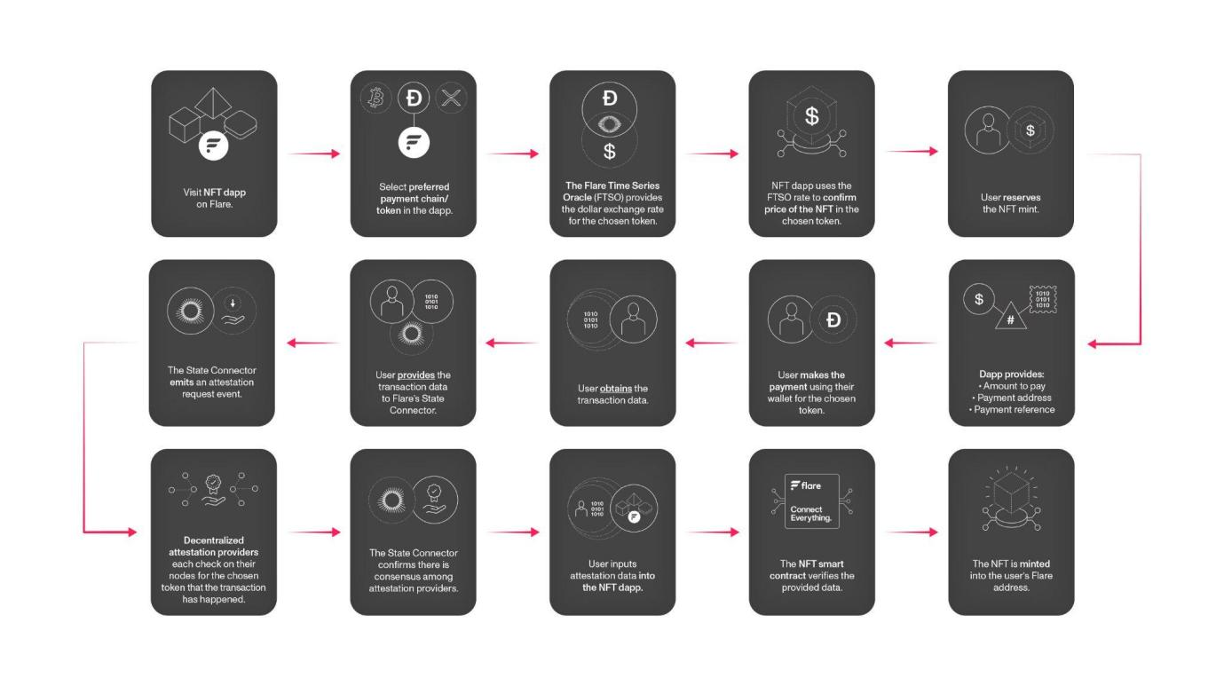 Flare两项核心协议之一的状态连接器,它允许信息与Flare上基于EVM的智能合约一同使用,以安全、可扩展且免信任方式进行,而这些信息涵盖来自于其他区块链及互联网。因而,发生在非Flare链上的交易可以通过这一协议进行确认,同时包括验证支付参考信息的准确性。