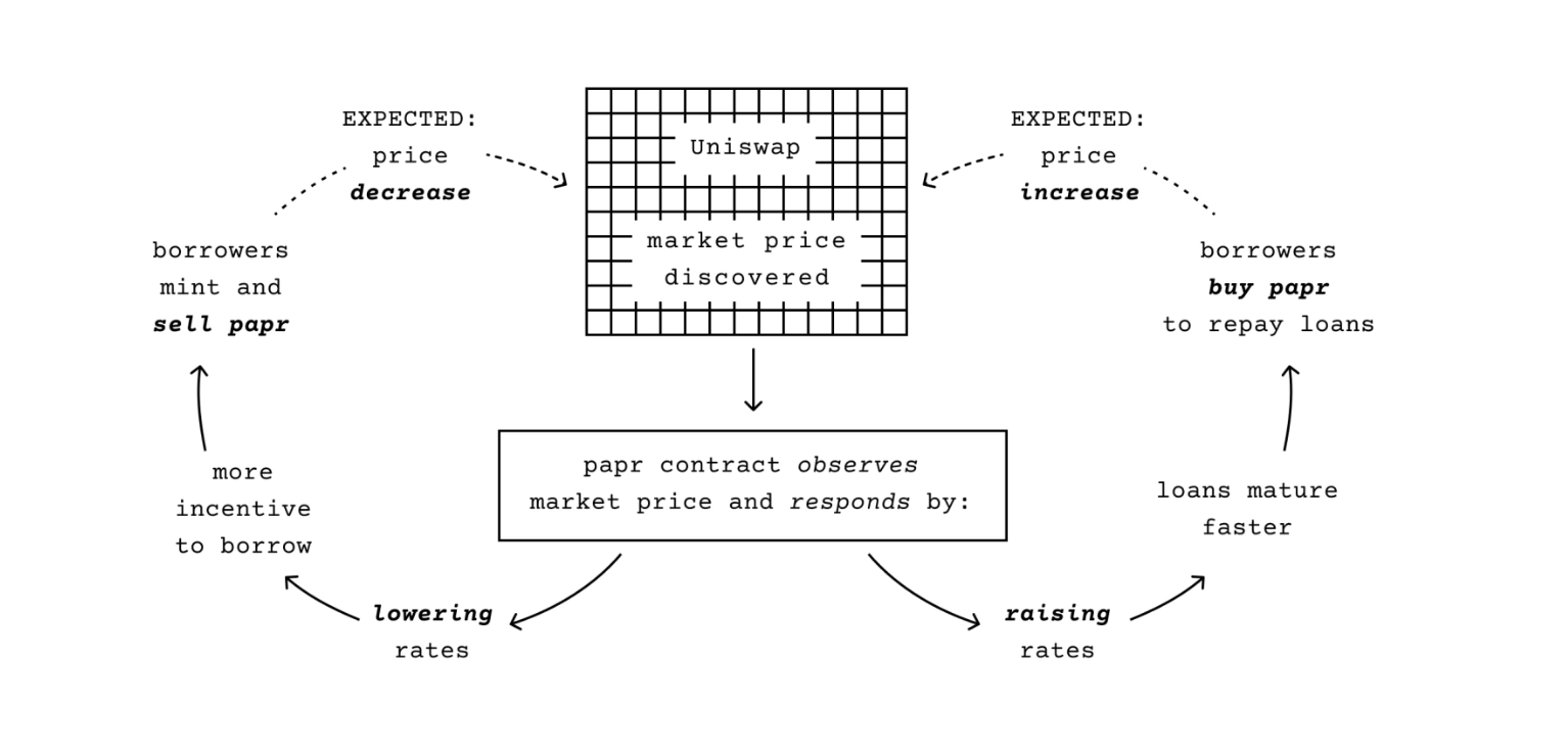 借方将抵押品存入papr智能合约,铸造一种原生代币$paprMEME,并通过Uniswap V3卖出,兑换成ETH等资产。借款的利息会直接计入$paprMEME的目标价格,理论上,随着时间的推移,$paprMEME的价格会逐渐上升。借方在归还贷款时只需要支付和借入数量相等的$paprMEME,但因为价格上升,也就实现了利息的支付。