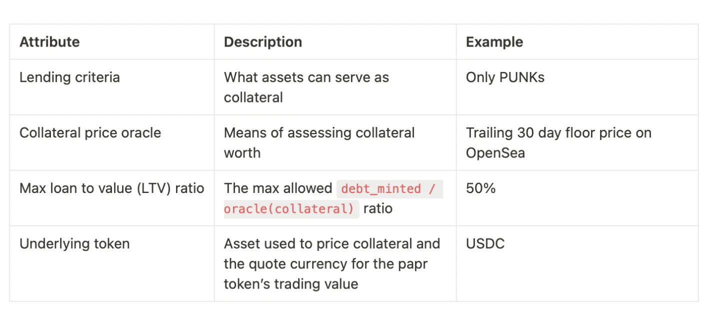 Papr的清算规则在一项借贷中,决定抵押品能不能用、最多能够借多少资金、什么时候清算,由以下几个参数决定,包括抵押品种类、抵押品价格、最大贷款价值比(LTV)、底层资产的价值。Papr使用Reservoir的预言机,可以取用一段时间内地板价的加权平均值,以防止通过短期交易来操控预言机价格。