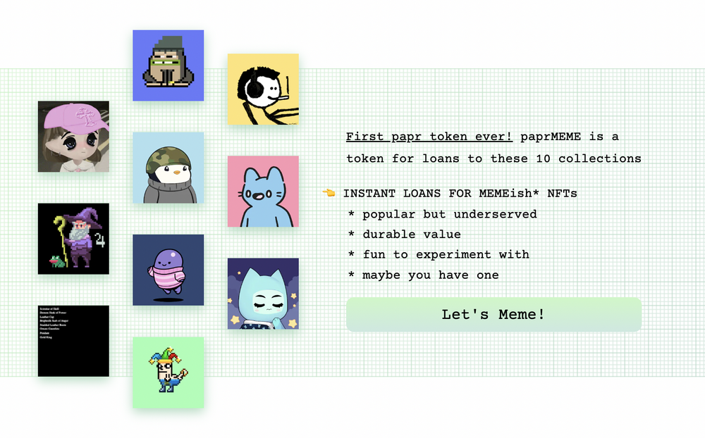 目前Papr的产品已经上线,首个$paprMEME可用以下十种NFT进行抵押铸造。
