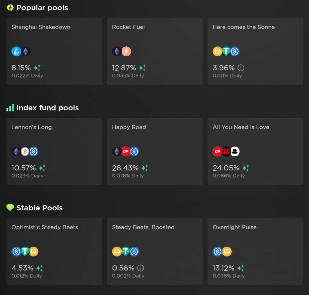 另一些 OP 的 DEX 比如 Beethoven X,Rubicon 也值得关注。Beethoven X 旨在成为一个一站式去中心化投资平台,除了 Swap 功能,如下图所示,会根据热点板块提供投资组合建议,一键组合投资。