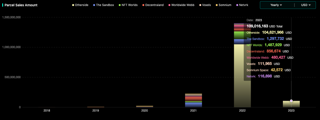 但Decentraland的市场确实正被其他竞争对手瓜分。Metacat数据显示,2022年,Otherside的土地销售高达10.4亿美元,其次是NFT Worlds为1.2亿美元,The Sandbox则以8510万美元位列第三,而Decentraland则以4820万美元排名第五,仅占全年成交总额的3.4%。而从今年销售表现来看,Otherside仍以1.04亿美元稳居市场首位,占据95.4%的市场份额,而Decentraland以85.6万美元占据7.7%。相比后来者Otherside,Decentraland被“吊打”,甚至也不如不少其他同期的竞争对手。