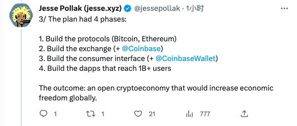 一是(帮助)构建协议,比如比特币、以太坊; 二构建交易所,也就是你们熟知的 Coinbase; 三是构建用户工具,比如 Coinbase Wallet; 四则是打造可承载 10 亿用户的 Dapps;该计划的最终愿景是通过开放式的 Crypto 经济来提高全球的经济自由度。