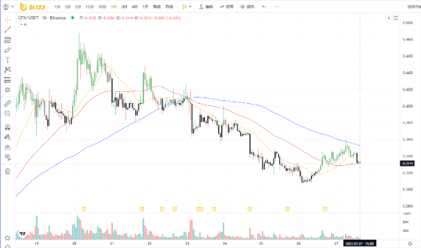 根据加密货币最新数据,截至2023年3月27日CFX的价格为0.3318美元,较昨日下跌5.79%,最高价为0.3522美元,最低价为0.3299美元