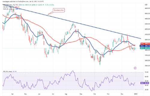 20天指数移动平均线(EMA)3,880正在向下倾斜,相对强弱指数(RSI)接近45,表明空头略有优势。如果多头想要占上风,他们将不得不将价格推高到移动平均线上方。