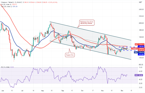 以太币$1,24612月7日跌破20日均线1,254美元,但空头无法维持较低的水平。多头买入下跌,并在12月8日将价格推回20日均线上方。