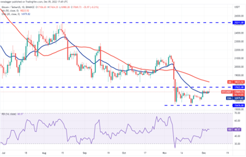 在过去四天接近20日均线(16,979美元)后,比特币试图在12月5日走高。然而,当天烛台上的长灯芯表明在更高的水平上卖出。