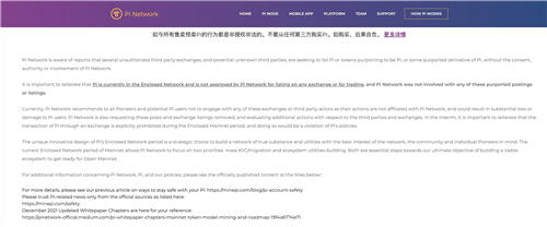 "PI目前在封闭的主网中,不允许外部连接,PI网络不隶属于且未授权给任何交易所上架,此类行为可能无法在真正的Pi上运行。参与可能会导致损失,仅信任官方渠道。"
