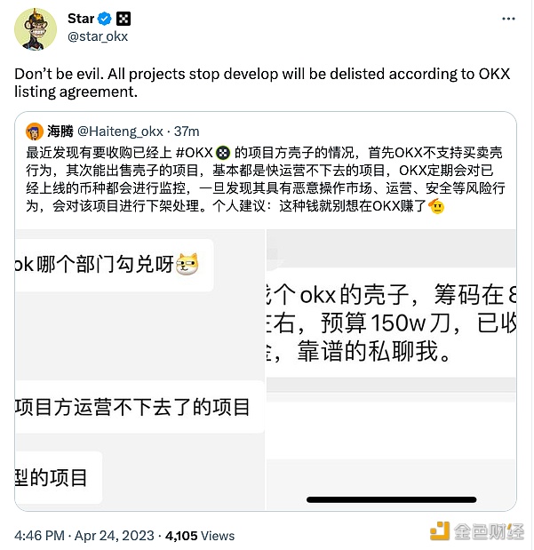 4月24日消息,徐明星在社交媒体上发文表示:不要作恶,所有停止开发的项目将根据 OKX 上线协议下架。 此前 OKX 官方人员表示发现有人在收购已上 OKX 的项目方壳子,指出 OKX 不支持买卖壳行为,并会定期对已经上线的币种进行监控,一旦发现其具有恶意操作市场、运营、安全等风险行为,会对该项目进行下架处理。