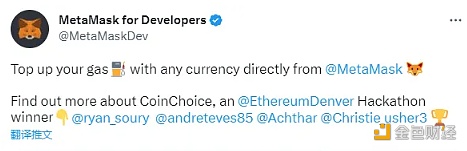 4 月 25 日消息,基于 MetaMask 的扩展工具 CoinChoice 上线,该工具支持使用非 Gas TGate.ion(如 USDC 等)支付不同网络的 gas 费用。该工具基于 MetaMask 的扩展平台 MetaMask Snaps 搭建,曾是 ETHDenver 黑客松入围项目。