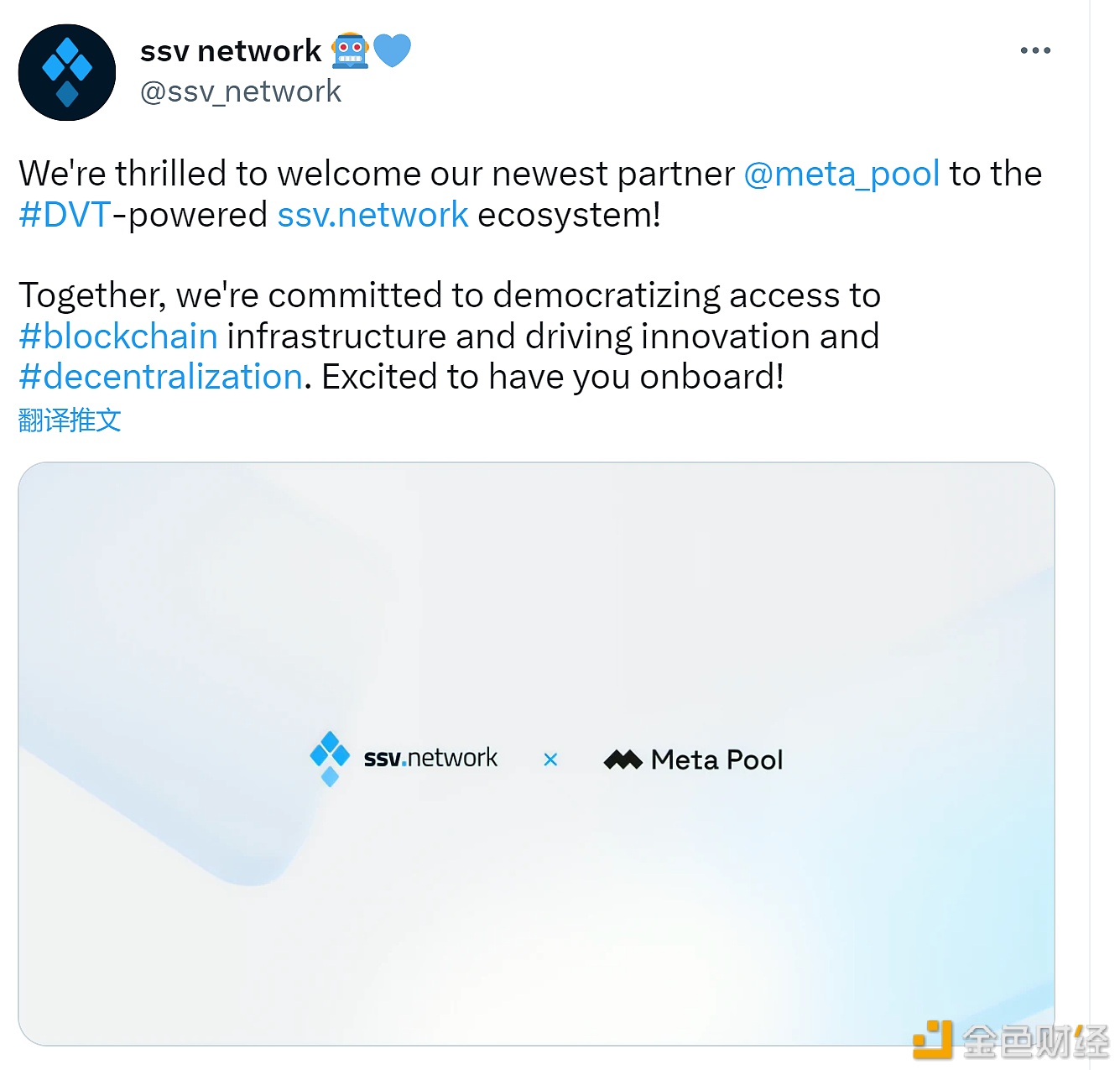 据官方推特,去中心化以太坊质押基础设施SSV.Network宣布与Meta Pool达成合作,Meta Pool是基于NEAR生态的流动性质押解决方案。SSV.Network是基于DVT技术的去中心化验证器基础设施。