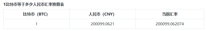 比特币兑换人民币的最新汇率为:200099.062074(1比特币 = 200099.062074人民币)