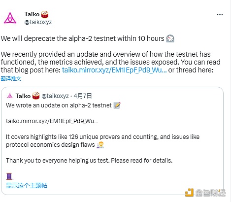 Taiko将在10小时内弃用alpha-2测试网
