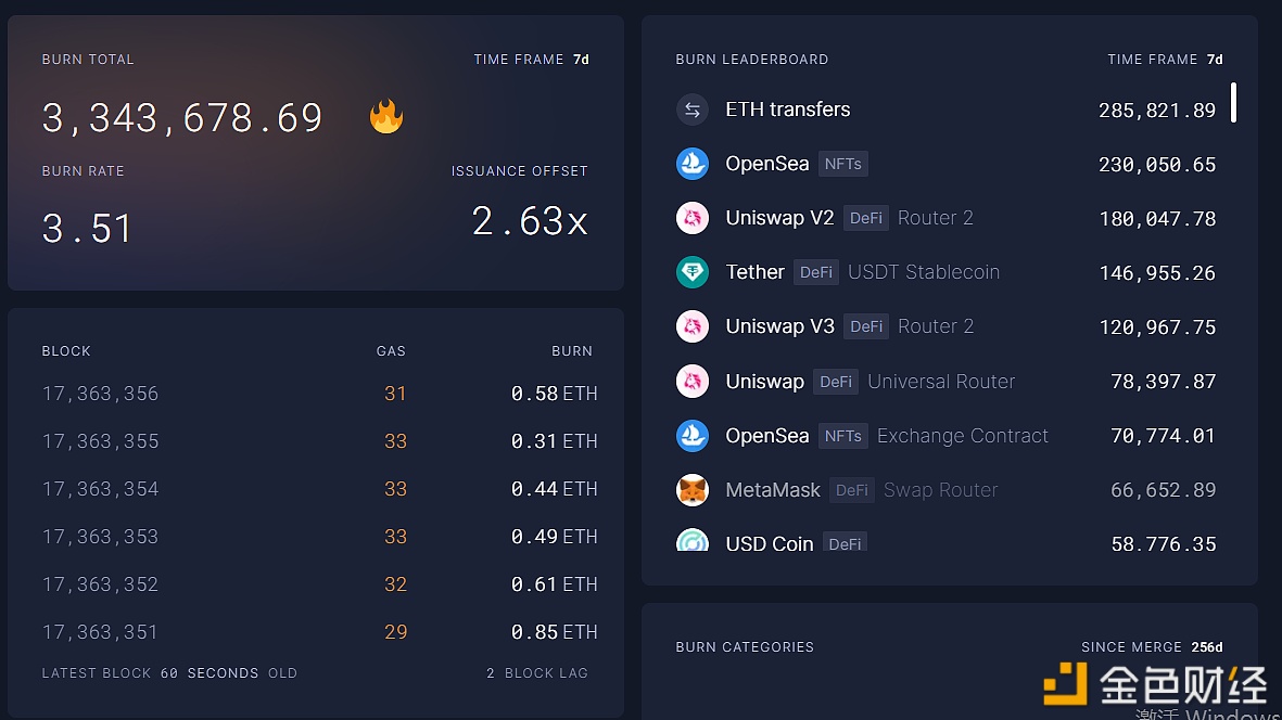据Ultrasound数据显示,截止目前,以太坊网络总共销毁3343675.25枚ETH。其中,OpenSea销毁230050.65枚ETH,ETHtransfers销毁285821.89 枚ETH,UniswapV2销毁180047.78 枚。注:自以太坊伦敦升级引入EIP-1559后,以太坊网络会根据交易需求和区块大小动态调整每笔交易的BaseFee,而这部分的费用将直接燃烧销毁。