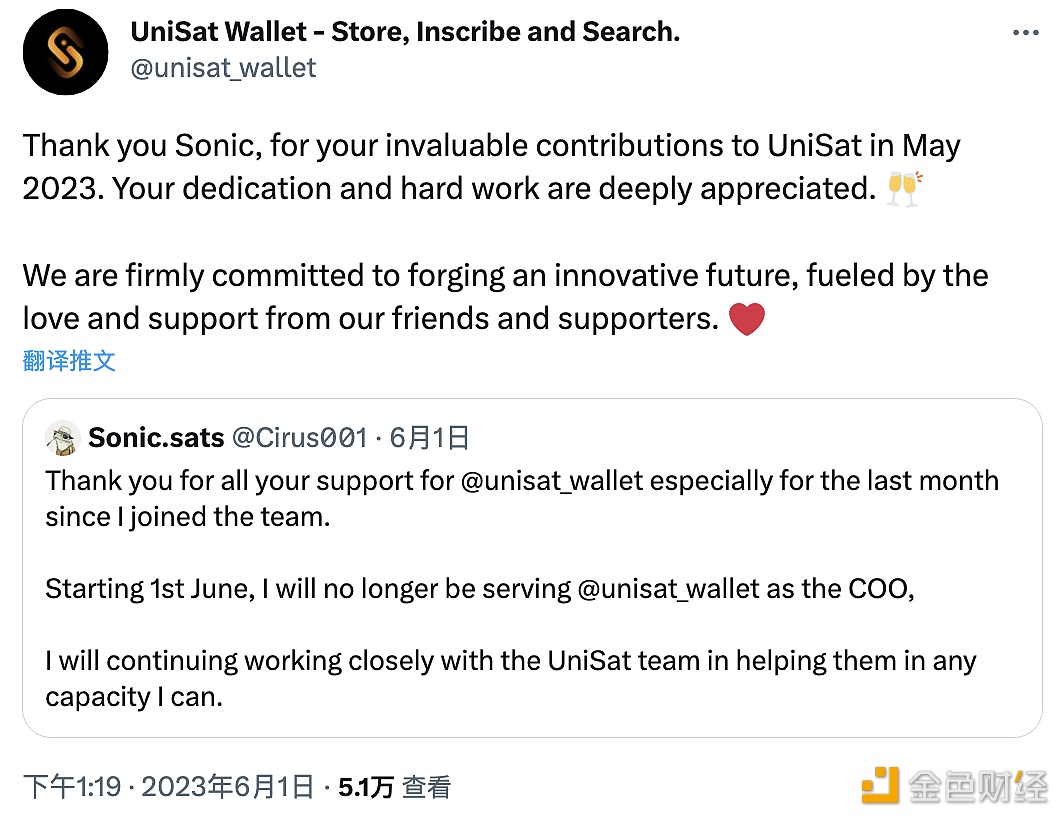 Sonic表示,从6月1日开始,将不再担任UniSat的首席运营官,将继续与UniSat团队密切合作,尽所能帮助他们。