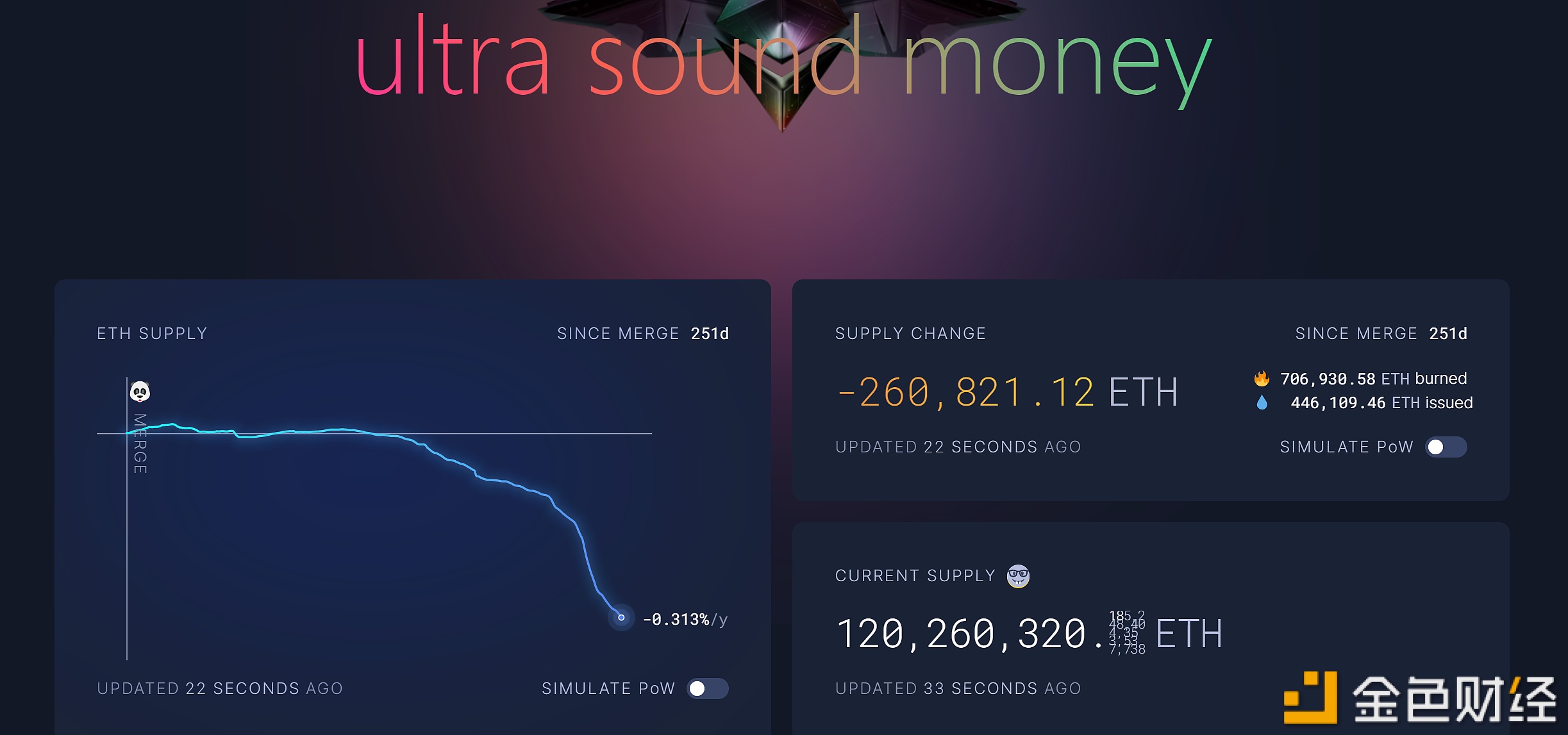 据ultrasound.money数据显示,以太坊自合并以来流通量已减少260821.12枚,当前的年化通缩率为-0.32%。