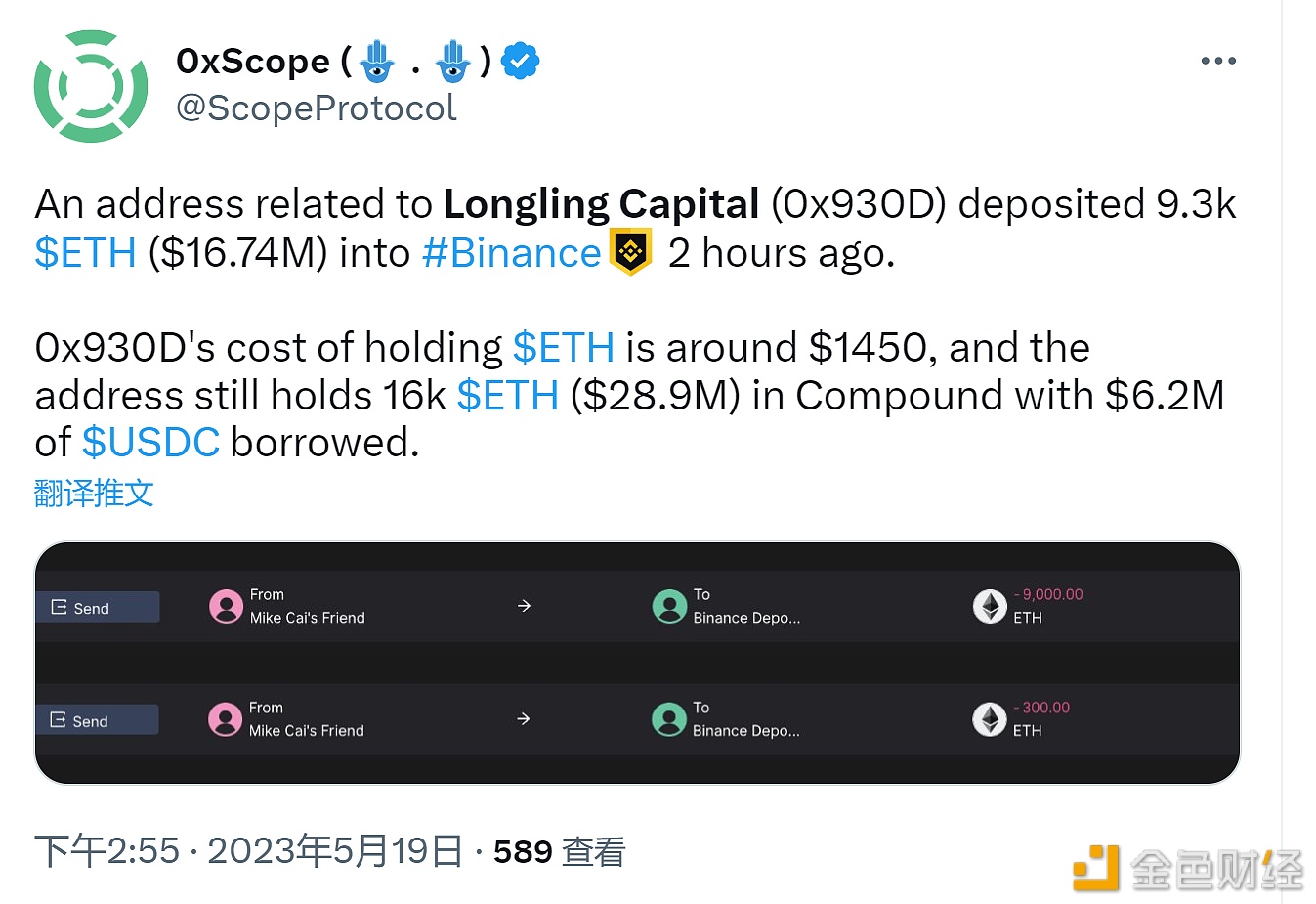 5月19日消息,Web3知识图谱协议0xScope发推文称,Longling Capital相关(0x930D开头)地址在2小时前将9300枚ETH (1674万美元) 存入币安。 该地址持有ETH的成本约为1450美元,目前仍在Compound中持有16000枚ETH(约合2890万美元),并借入620万枚USDC。