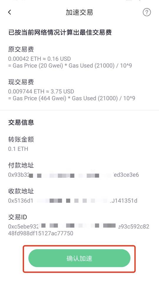 2. 点击【加速交易】后进入加速交易页面,点击底部【确认加速】